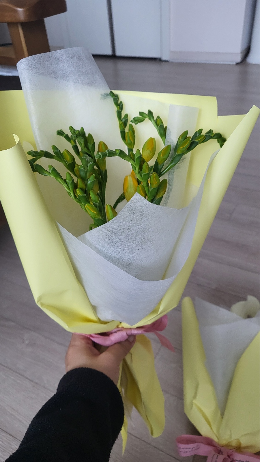 카라꽃은 3송이에 9,000원에 후리지아는 6,000원에 한단씩 사왔어요.