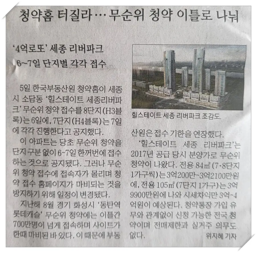 4억로또 세종시 리버파크의 무순위 청약에 청약홈이 터질까 이틀로 나눠서 청약을 신청받는다는 기사다.